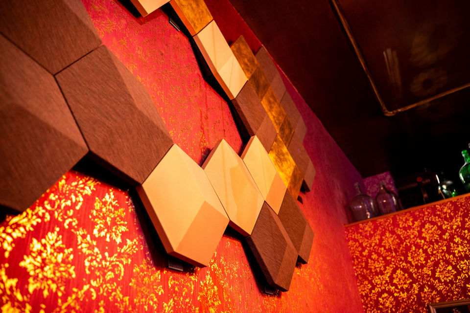 To ensure optimal sound distribution throughout this popular hotspot, we strategically installed Beolab 28 speakers, providing enough power to fill the space. We also integrated the Beosound Shape, not only for its aesthetic value but to significantly improve the acoustics. Staying true to the theme, some of the Beosound Shape tiles were plated with real gold.